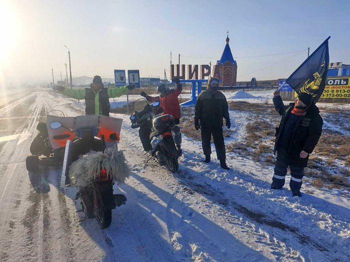 А вот дальше в наши планы вмешался суровый сибирский климат. Изначальный расчет был на то, что в конце февраля и начале марта будет -10 или даже теплее, но, как все мы знаем, к нам пожаловал какой-то там циклон, радикально поменявший погодные условия. В общем, из Саяногорска, когда мы в 9:00 выезжали с нашего байк поста, на термометрах было - 26. Ехали на мопедах объемом 50-150 кубиков, а еще к нам присоединился дрифт-трайк, он без подвески. Тот, кто знаком с подобной техникой сразу поймет, что агрегат это специфический, и от продолжительной езды на нем по трассе позвоночник будет в полном шоке. Выехали мы в составе: Тимур Насыров, Виталий Табашнюк, Максим Левковский, Андрей Молчанов, а в сопровождении на авто с прицепом шел Дмитрий Богданов. На тот момент холод нас не пугал, больше мы переживали, что на трассе может быть гололед, особенно на перевалах. Между тем, с дорогой нам повезло, а асфальт по мере движения был чистый. Когда проезжали в районе Черногорска, у моего мопеда стал капризничать мотор. Скоро он совсем заглох, но, к счастью, получилось быстро починить. Предположительно в бензин попала вода, что и вызывало проблемы на морозе. Немного не доезжая Шира, у Виталия Табашнюка тоже забарахлил, а потом и полностью встал мотор.