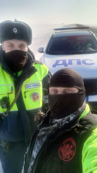 Вперед и только вперед, а как же иначе! Очень мерзли руки, но все остальное было вполне терпимо. Было! До тех пор, пока на трайке не побежал редуктор. Учитывая погодную ситуацию, мы приняли непростое решение, не чинить его в дороге на жутком морозе, а сколько можно ехать до конца. Вообще от Шира до Ачинска погода словно решила проверить нас на прочность. Ближе к Назарово мороз будто бы стал еще злее, взяв себе в союзники пронизывающий ветер. Дорога была сухой, но вдыхаемый воздух резал легкие. Ехали медленно, 40-50 км/ч, потому что быстрее мопеды просто не позволяли, да и на льду рисковать не хотелось. Поддерживало то, что водители фур объезжали нас очень аккуратно, некоторые сигналили и показывали большой палец вверх. Это, конечно, грело душу, но не ноги с руками. Примерно в районе 14:00, когда мы уже проехали посёлок Ужур, а до Назарово оставалось километров двадцать, нас тормознул экипаж ГИБДД. Ребята ехали навстречу, в противоположную сторону, но, увидев такую картину, развернулись и догнали нас. Вопреки ожиданиям, они к нам совершенно не докапывались и даже не спросили документы. Было видно, что они просто офигели от увиденного: «Вы чего, отмороженные совсем? В такой мороз и на мопедах? Откуда вы едете?» Мы ответили, что из Саяногорска, а путь держим в Ачинск на мотопати. Они только головами качали в крайнем удивлении, снимая нас на телефон.
