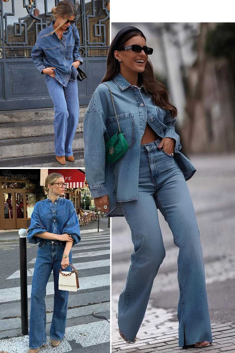 И конечно деним. Если в комплекте одна джинсовая вещь, то такая схема не выйдет из моды никогда. Тем более, деним отлично сочетается со всем.