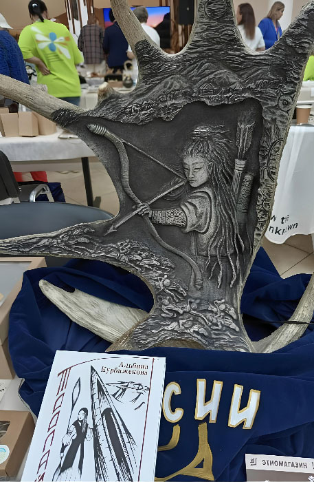 Как же было приятно, когда первое место в категории «Этнографический сувенир VIP» завоевало наше панно «ТООЛАЙ АРЫХ» ( автор - мастер Пахта). Эта победа особенная для нас еще и тем, что данная работа основана на хакасском эпосе, повествующем о древней культуре нашей прекрасной республики. Выполнена она в технике резьбы по рогу, а в основе сюжета лежит красивая легенда о девушке-воительнице.