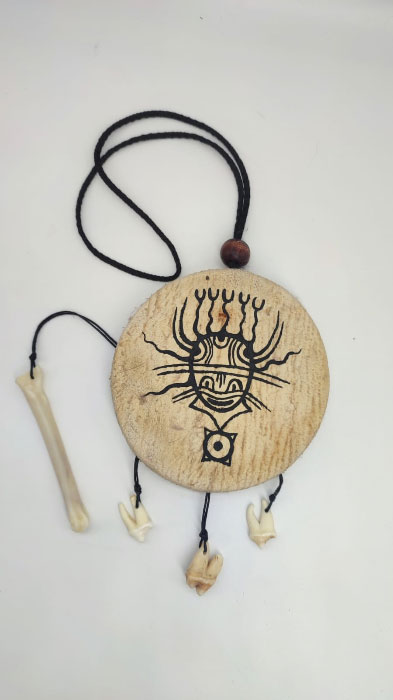 Бубен - занял призлвое место на конкурсе Туристический сувенир. Автор Колычева Юлия, изготовлен из кожи волка. Атрибутика - кость и зубы волка. Рисунок относится к Окуневской культуре